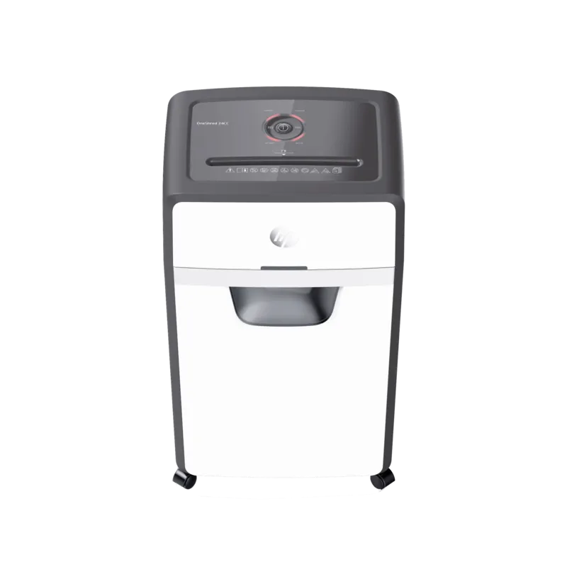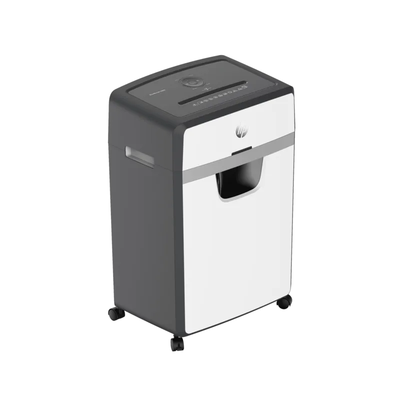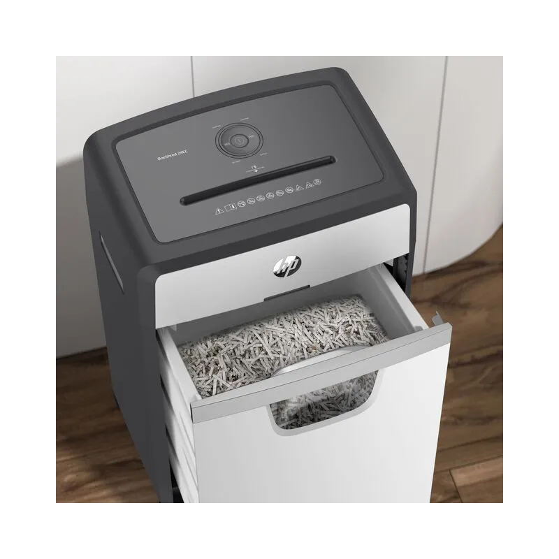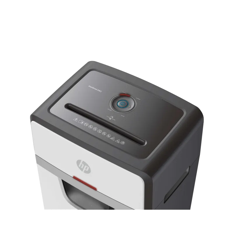 Destructeur de documents HP One Shredder 24CC – Peut détruire Papier, carte de crédit, trombones et agrafes – Taille de coupe: 4 x 35 mm – Type de coupe Coupe de particules / Coupe transversale – Capacité de coupe 24 feuilles DIN A4 (80 g / m²) – Niveau de sécurité : P-4 / DIN 66399 – Largeur d’entrée 220 mm A4 – Capacité de la corbeille 30L – Vitesse de destruction: 1.6 m/min – fonctionnement silencieux du moteur 65dB – Durée de fonctionnement 30 minutes – Temps de refroidissement 50 minutes – Dimensions 424.3 x 295 x 644.5 mm – Garantie 1 an
