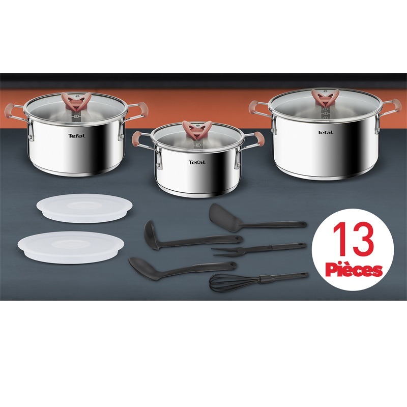 Pack TEFAL De 13 Pièces – 3x Faitouts avec couvercles: Diamètre: 18 cm, 20 cm et 24 cm – Matériau: Acier inoxydable – Avec Couvercles en plastique 20/18 cm – Avec 5 ustensiles (fourchette, spatule, fouet, louche, cuillère) – Compatibilité avec les cuisinières: Toutes, y compris l’induction – Poignées Fixe – Revêtement antiadhésif – Cuisson saine – Facile à nettoyer – Durable et léger – Couleur: Inox et Noir