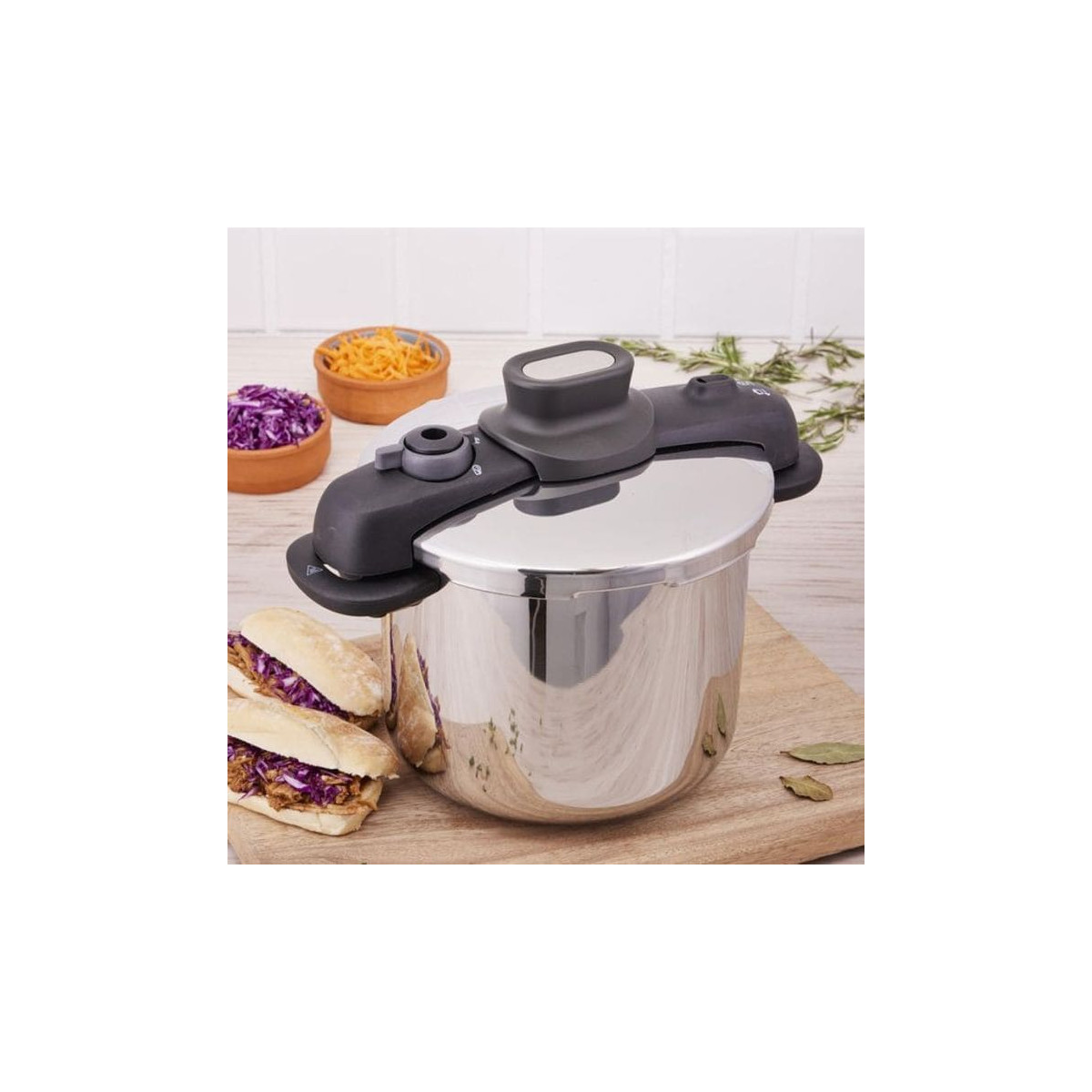 Cocotte TEFAL – Capacité: 8 Litres – 5 Système de sécurité – Se verrouille instantanément en une seule diapositive – 2 Programmes de cuisson – Cuisine saine – Indicateur de pression – Facilité de nettoyage – Design compact et moderne – Couleur: Inox – Grantie: 1an