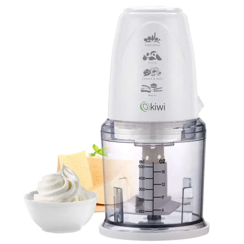 Mini Hachoir KIWI – Puissance: 260W – Capacité tasse: 500g – Fonction turbo – Tasse transparente graduée – Lame en acier inoxydable – Couvercle de coupe (peut également être utilisé comme base) – Idéal pour hacher la viande, les céréales, les noisettes, les oignons – Garantie 1 an