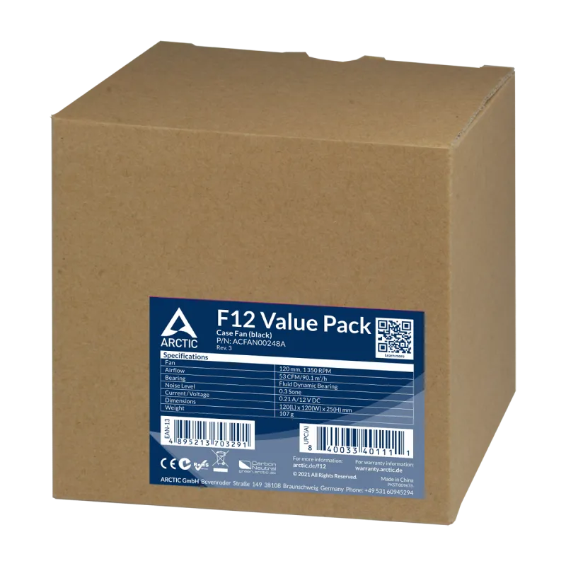 Ventilateur de boîtier Arctic F12 120 MM / 5 Pièces – Vitesse du ventilateur: 1350 tr/min – Flux d’air: 53 PCM | 90,1 m³/h – Pression statique: 1,00 mmH2O – Niveau de bruit: 0,3 Son – Cadre du ventilateur Standard – Type de contrôle: Vitesse fixe – Connecteur à 3 broches – Roulement du ventilateur: Roulement dynamique fluide – Température ambiante de fonctionnement: 0—40 °C – Tension de démarrage: 2.7 V – Longueur de câble: 400 mm – Dimensions: 120 x 120 x 25 mm – Poids: 107 g – Couleur Noir – Garantie 1 an