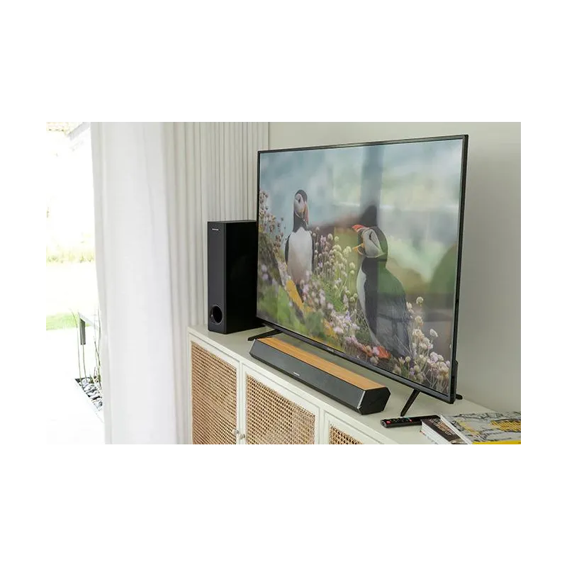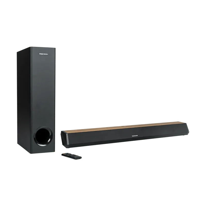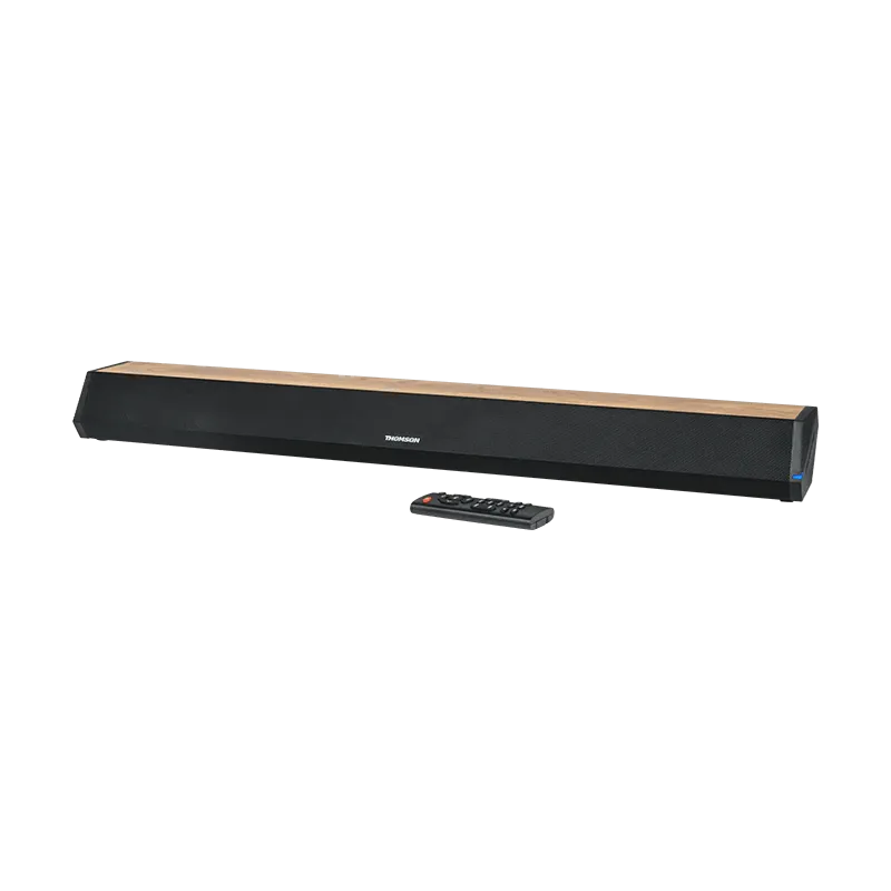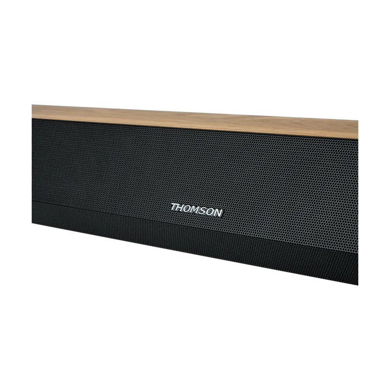 BARRE DE SON AVEC CAISSONS DE BASSES THOMSON COSY SB552BTS – Bluetooth 5.0 – Systeme stéréo 2.1 – Entrées : TV AUDIO, OPTIQUE (câble inclus), AUX-IN 3.5mm (câble inclus), USB – Égaliseur (film, musique, voix) – Caisson de basses filaire – Télécommande (piles non incluses) – Puissance musicale totale: 400 W – Fixation murale possible – Indicateur lumineux pour la source sonore – Alimentation 230 V – Couleur Noir et bois – Garantie 1an