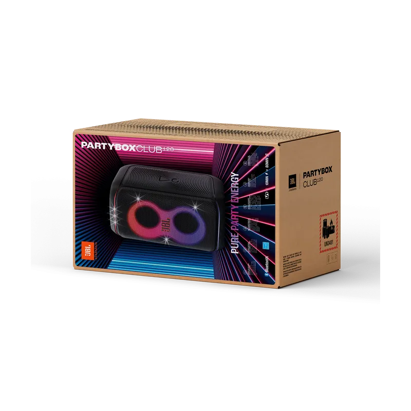 Haut-Parleur Bluetooth JBL PartyBox Club 120 – Puissance: 160 W – Réponse en fréquence dynamique: 40 Hz – 20 kHz (-6dB) – Version Bluetooth: 5.3 – Temps de Charge Batterie: 3.5 heures – Autonomie Batterie: 12 heures – Fonction Karaoké – Multi-point Connection – Entrée jack 3.5 mm – Jeu de lumières – Résiste aux éclaboussures – Supports Auracast – IPX4 – Entrée guitare – Entrée micro – Entrées double micro et guitare – AI Sound Boost – Dimensions: 28.8 x 57 x 29.7 cm – Poids: 11.05 kg – Couleur Noir – Garantie 1 an